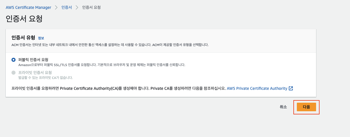 앞으로 aws에서 https 프로토콜을 사용하고 싶으면 여기서 발급받은 인증서를 사용하게 될 것이다.