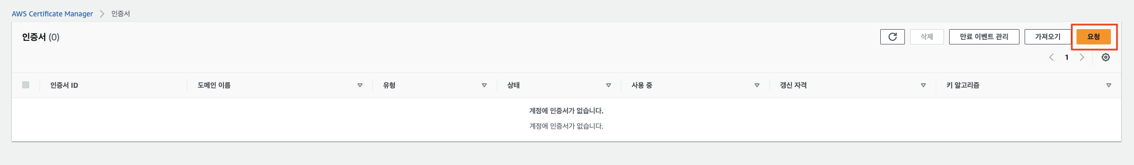 aws AWS Certificate Manager 메뉴로 이동후 오른쪽 상단 요청 버튼 클릭