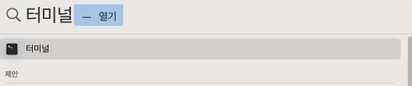1. 일단 comand + space 누르면 검색창이 뜨는데 거기에 이렇게 터미널이라고 검색하고 결과로 나오는 터미널 클릭